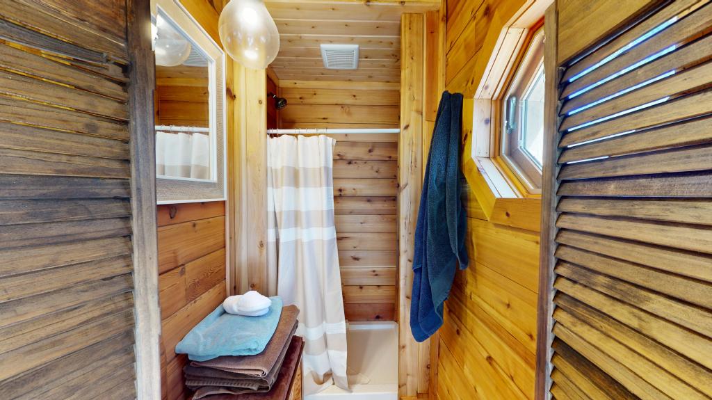 Inviting cedar change room and shower through saloon style doors.
